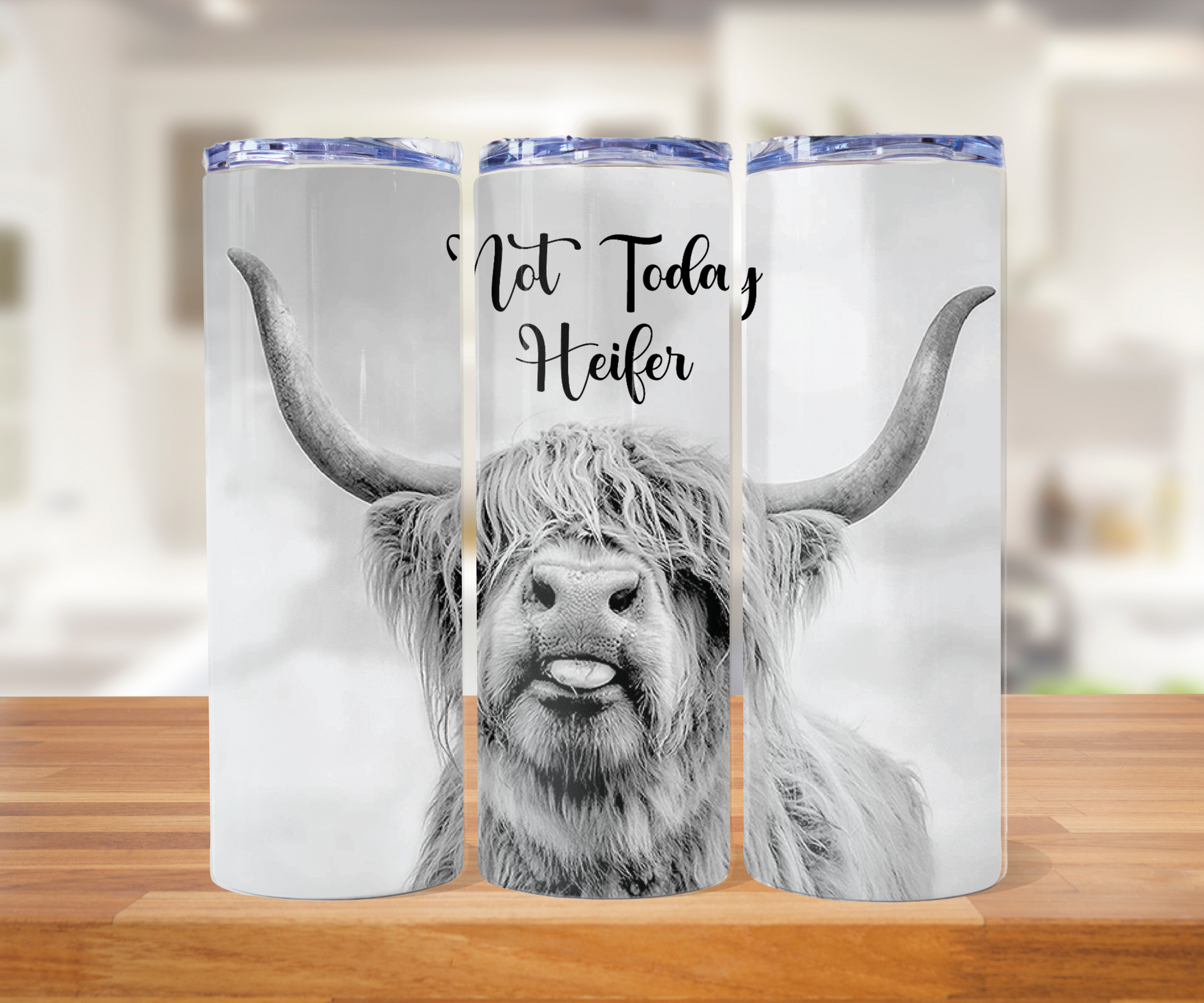 This 20oz stainless steel Tumblr is perfect for keeping your drinks cold or hot on the go. With a humorous "not today heifer" design featuring a cow, it's both functional and fun. Take on your day with a touch of sass and style.