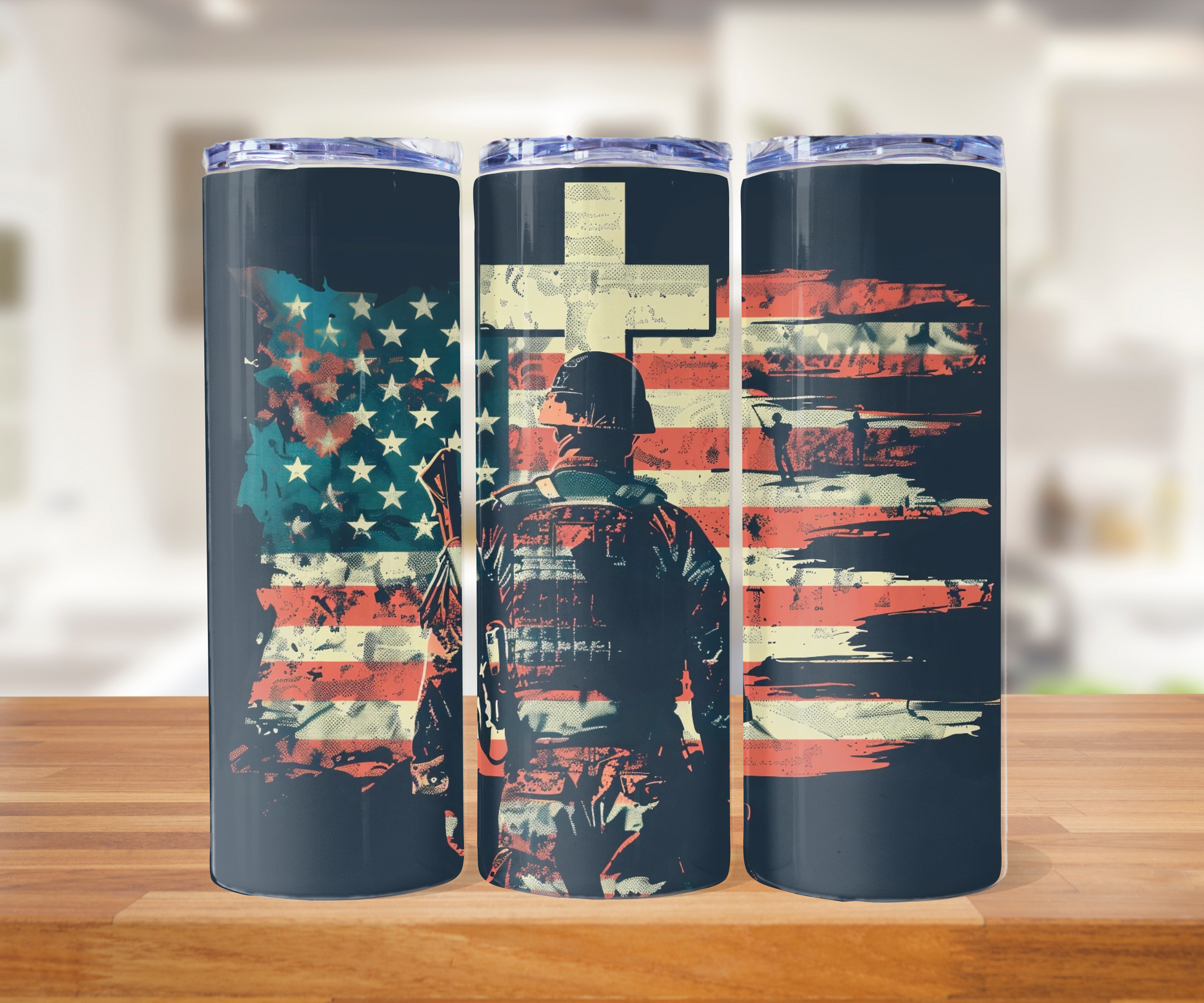 Expertly crafted for the patriotic soldier, this 20 ounce stainless steel Tumblr features an American flag design with a bold cross. Durable and stylish, it keeps your drinks at the perfect temperature while showcasing your love for your country. Show your pride every time you take a sip.